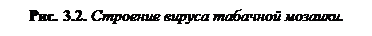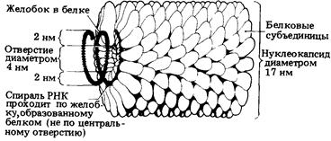 Вирионы многих вирусов растений и ряда фагов имеют спиральный капсид, в котором белковые субъединицы (капсомеры) уложены по спирали вокруг оси. Например, ВТМ (вирус табачной мозаики) имеет форму палочек диаметром 15 – 17 нм и длиной до 300 нм (рис. 3.2.). Внутри его капсида имеется полый канал диаметром 4 нм. Генетическим материалом ВТМ яв