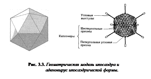 Капсиды вирионов многих вирусов (например, аденовирус, вирус герпеса, вирус желтой мозаики турнепса – ВЖМТ) имеют форму симметричного многогранника, чаще всего икосаэдра (многогранник с 12 вершинами, 20 треугольными гранями и 30 ребрами). Такие капсиды называют изометрическими (рис. 3.3.). В таких вирионах содержание белка составляет около 50% по отношению к НК.