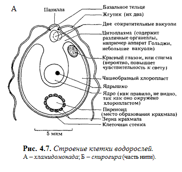 Строение клетки. Организация клетки большинства водорослей мало отличается от организации типичных клеток растений, однако имеет и свои особенности (рис. 4.7.).