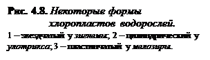 По форме они могут быть чашевидными (хламидомонада),спиральными (спирогира),пластинчатыми (мелозира), цилиндрическими (улотрикс), звездчатые (зигнема) и др. (рис. 4.7., 4.8.).