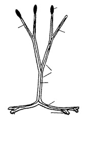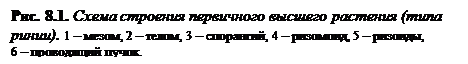Большинство первых наземных растений не имело расчленения тела на стебель и листья, у них не было и корней (рис. 8.1). Тело их было представлено рядом осевых радиально-симметричных участков, обладавших дихотомическим ветвлением (мезомы). На конечных их разветвлениях (теломы) развивались спорангии. В нижней части развивались подземные участки тела, прикреплявшие растение к субстрату (ризомоиды). Они были покрыты ризоидами. У некоторых представителей (астероксилон и др.) уже появляются листья. Многие имели водорослевый облик (тениокрада и др.), другие напоминали уже современные плауны, хвощи и папоротники. Это были земноводные растения. Их нижняя часть была погружена в воду или илистый грунт, а верхушки находились в воздушной среде.