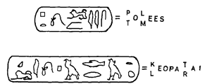 Рис. 22. Иероглифы. Картуши с обозначением имен Птолемея и Клеопатры (из верхнего текста Розетского камня).