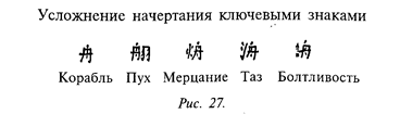 Во-первых, в отношении к лексике. Таким путем пошла китайская письменность. Так, для обозначения понятия «слеза» нужно было сочетать два знака: «глаза» и «воды»; для того чтобы выразить понятие «лаять», надо было соединить знаки «собаки» и «рта». Иногда логика этих сочетаний делается малопонятной, например в китайском письме иероглиф «корабля» в сочетании со знаком «пламени» надо понимать «пожар», а в сочетании со знаком «рта» – «болтливость» (см. рис. 27). Этот путь сокращения идеографического алфавита был малопродуктивным.