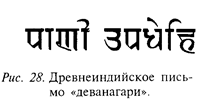 Лучшим примером такой слоговой системы служит древнеиндийское письмо «деванагари», где каждый знак, как правило, служил изображением согласной в сочетании с гласной а, т. е. слогов па, ба, та, да и т. п.; для того чтобы читать другую гласную, применялся тот или иной надстрочный или подстрочный знак; если же требовалось передать одну согласную, то ставился особый подстрочный «запретительный» знак вирама (см. рис. 28).