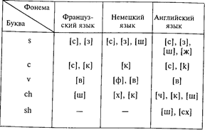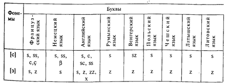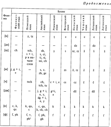 В качестве иллюстрации затруднений и приемов восполнения недостатка латинского алфавита для пользующихся им народов может служить следующая таблица, где показано, как одна и та же фонема передается разными буквами.