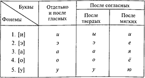 5. Буквы э–е, а–я, о–е, у–ю, ы–и обозначают пять гласных фонем, причем двойной комплект букв (10 букв для пяти фонем) объясняется предыдущим пунктом, т. е. графическим приемом обозначения твердого и мягкого слога, так как в русском алфавите нет особых букв для твердых и мягких согласных;тем самым сочетания букв та–тя, ту–тю показывают не различия гласных, а различие согласных: твердые (в написаниях та, ту) или мягкие (в написаниях тя, тю). Употребление русских гласных объясняется следующей таблицей: