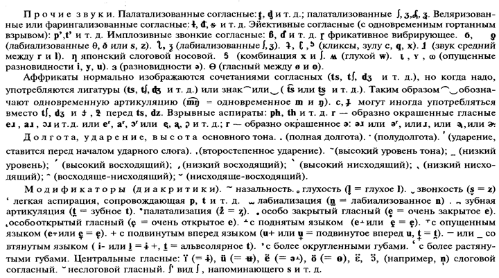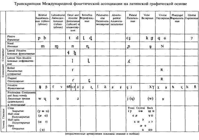 Из применяемых в практике Советского Союза транскрипций чаще всего встречается либо система Международной фонетической ассоциации на латинской графической основе (МФА; по-французски AIP «Association Internationale Phonetique», по-английски IPA «International Phonetic Association», см. таблицу на с. 378–379), либо Русская фонетическая азбука (РФА) на русской графической основе (существующая в разных вариантах).