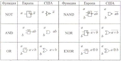 Схеми ЕОМ будуються з логічних елементів, званих вентилями. При цьому практичне значення мають тільки вентилі, що відповідають повноваженням NOT, NAND і NOR. Це пов'язано з тим, що вентилі будуються на основі транзисторів, які мають внутрішню інверсію. Тому вентиль, відповідний функції NAND (NOR) має менше транзисторів і змінює свій стан в два рази швидше, ніж вентиль AND (OR). Вентилі, що відповідають повноваженням AND і OR, мають теоретичне значення, як і вентиль, відповідний функції EXOR. Позначення основних вентилів для європейського і американського стандартів показані в табл. 6.3.