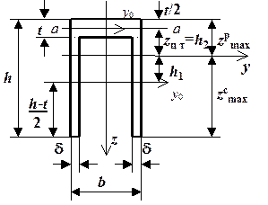 Найдем геометрические характеристики заданного поперечного сечения: осевые моменты инерции относительно главных центральных осей. Сечение имеет только одну ось симметрии, эта ось является одной из главных осей инерции. Обозначим ее z. Вторая главная ось y проходит через центр тяжести сечения. Определим положение центра тяжести сечения по формуле