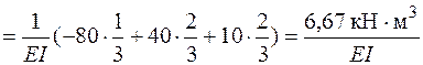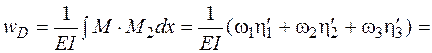 Чтобы найти прогиб сечения D, используем при перемножении эпюру М 2. Ординаты на эпюре М 2 под центрами тяжести треугольников будут такими: