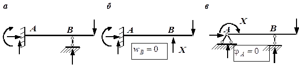Рис. 4.32. К расчету статически неопределимой балки: а – заданная статически неопределимая балка; б – основная система и условие совместности деформаций (вариант 1); в – основная система и условие совместности деформаций (вариант 2)