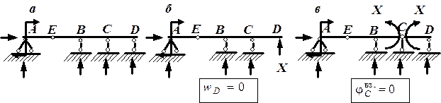 Рис. 4.33. К расчету статически неопределимой балки с шарниром: а – заданная статически неопределимая балка; б – основная система и условие совместности деформаций (вариант 1); в – основная система и условие совместности деформаций (вариант 2) |