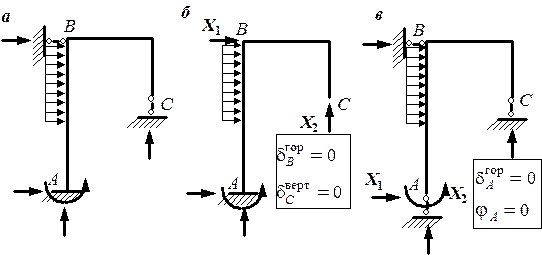 Рис. 4.34. К расчету статически неопределимой рамы: а – заданная статически неопределимая рама; б – основная система и условия совместности деформаций (вариант 1); в – основная система и условия совместности деформаций (вариант 2) |