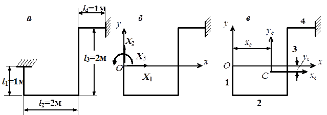 Выберем основную систему, отбросив левое закрепление и приложив реактивные силы (лишние неизвестные) Х 1, Х 2 и Х 3 (рис. 4.48, б). Для определения значений лишних неизвестных по формулам (4.30) – (4.32) найдем сначала положение упругого центра и геометрические характеристики