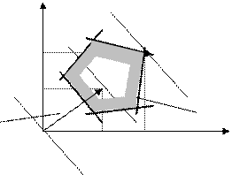При указанных условиях в одной из вершин многоугольника функция цели принимает максимальное значение. Для определения данной вершины строится вектор-нормаль с координатами – коэффициентами функции цели