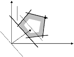 . Перпендикулярно вектору-нормали построим линию уровня C1 × Х1 + C2 × Х2 = h (где h – некоторое число, которое подбирается таким, чтобы эта линия уровня проходила через многоугольник решений). Будем передвигать линию уровня в направлении вектора–нормали до тех пор, пока она не дойдет до последней общей точки с многоугольником решений. Координаты этой точки и определяют оптимальный план – решение задачи.