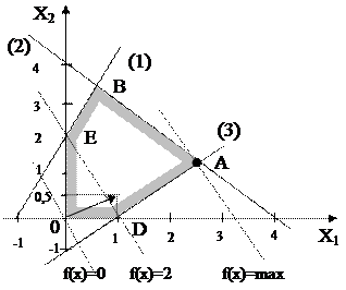 Построим прямые, уравнения которых получаем в результате замены в системе ограничений знаков неравенств на знаки точных равенств. Получаем уравнения прямых линий на плоскости. Для того, чтобы провести прямую линию, достаточно знать координаты двух точек. Проведем линию (1), соответствующую первому ограничению. Для этого присвоим переменной Х2 некоторое значение, например ноль, и определим значение переменной Х1, найдем координаты первой точки (-1; 0). Приравняв нулю переменную Х1, найдем значение переменной Х2 – координаты второй точки (0; 2). Для того, чтобы определить, с какой стороны от проведенной линии находится область допустимых значений, необходимо подставить в неравенство координаты какой-нибудь точки пространства, например начала координат (Х1 = 0, Х2 = 0). Полученное значение – ноль, меньше чем два (правая часть ограничения), а значит, точка начала координат принадлежит искомой полуплоскости. Повторим построения для всех остальных ограничений задачи и получим многоугольник решений ОDАВЕ. Построим вектор-нормаль, выходящий из начала координат в направлении точки с координатами – коэффициентами функции цели (Х1 = 2, Х2 = 1) или пропорциональными этим координатам (Х1 = 1, Х2 = 0,5). Линия уровня (соответствующая функции цели) строится перпендикулярно вектору-нормали или же функция цели приравнивается какому-либо числу, например f(x) = 2X1 + X2 = 2 и проводится соответствующая линия. Передвинем линию уровня в направлении, указанном вектором. В результате находим точку А, в которой целевая функция принимает максимальное значение. Находим координаты этой точки. Для этого решим систему уравнений, которые соответствуют прямым, на пересечении которых находится точка А:
