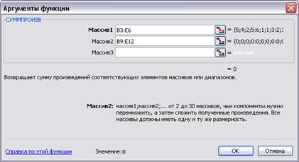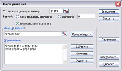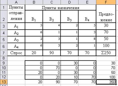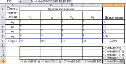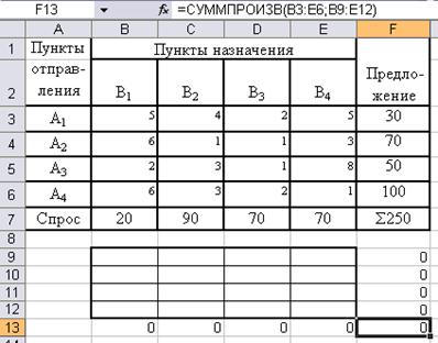 Аргументами функции СУММПРОИЗВ являются: Массив1 - адреса матрицы тарифов перевозок, Массив2 – адреса пустых ячеек, зарезервированных под размещение искомых переменных задачи (плана перевозок).