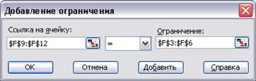 В левом окне формы Добавление ограничения (рис. 21) вводятся адреса левой части ограничений – суммы объёмов перевозок от поставщиков и суммы объёмов перевозок к потребителям. Знак ограничения устанавливается в виде знака равенства “ =“. В правом окне формы Добавление ограничения вводятся адреса правой части ограничений – числовые значения предложения и спроса.