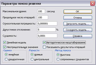 Нажав кнопку Параметры, следует поставить «галки», выделив пункты: Линейная модель, Неотрицательные значения и Автоматическое масштабирование (рис. 22).