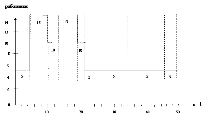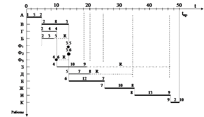 Критическим временем будет абсцисса самого правого конца всех отрезков (работ) диаграммы (tкр = 50 ч.).
