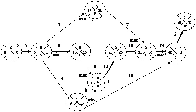 Расчет поздних сроков свершения событий начинается справа налево, от десятого события к первому. Из позднего срока свершения последующего события (правый сектор) вычитается продолжительность предшествующей работы, получаем поздний срок свершения предшествующего события. Если из предшествующего события входят несколько работ, то поздний срок его свершения определяется по минимуму, то есть из всех возможных значений позднего срока свершения выбирается минимальное.