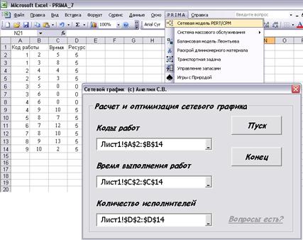 Для автоматизации расчёта параметров сетевой модели возможно использование программы «Расчёт и оптимизация сетевого графика» из ППП PRIMA. Для этого необходимо ввести коды работ в два смежных столбца Excel, ввести также длительности выполнения работ и количество необходимого ежедневно ресурса, например, трудового – требуемое количество исполнителей (рис. 39).