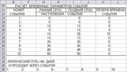 После таблиц выводится длительность критического пути и перечень событий, составляющих критический путь.
