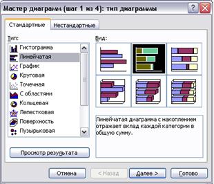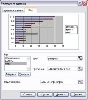 С помощью Мастера диаграмм на шаге 1 необходимо выбрать Линейчатую диаграмму с накоплением, которая позволяет строить горизонтальные отрезки. На шаге 2 указывается, что исходные данные содержатся в столбцах, после чего нужно переключиться на закладку Ряд. Далее следует Добавить Ряд 1, содержащий данные о ранних сроках начала работ, а в качестве Имени ввести слово: Обозначения. Ряд 2 содержит данные о продолжительности работ, а Ряд 3 – о полных резервах работ. На шаге 3 необходимо установить горизонтальные линии сетки, ввести название диаграммы – график Ганта и наименование осей – время и коды работ.