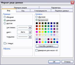 Для того чтобы сделать невидимыми синие горизонтальные полосы, соответствующие времени раннего начала работ, следует щелкнуть по любой из них правой кнопкой мыши и вызвать меню Формат рядов данных, в котором выбрать закладку Вид. Установить Границу – невидимую, а Заливку – прозрачную.