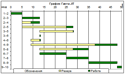 Для отображения фиктивных работ с нулевой длительностью можно искусственно установить для них после расчёта при построении диаграммы минимальную длительность, например, равную 0,3. Легенда диаграммы и подписи осей легко передвигаются с помощью мыши.