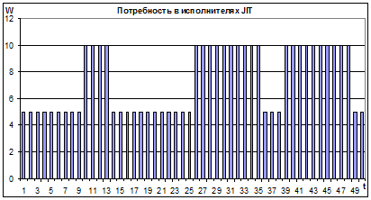 Диаграммы потребности в ресурсах (исполнителях) строятся на основе расчётных Данных для эпюры использования ресурсов. Если передвинуть время выполнения работ вправо за счёт имеющихся резервов, то можно сгладить пики потребности в ресурсах. Так, на первом графике (рис. 50), соответствующем ранним срокам начала работ, максимальное требуемое число исполнителей – 15, а если работы начинаются в возможно поздние сроки (just in time – JIT) – 10 человек (рис. 51).