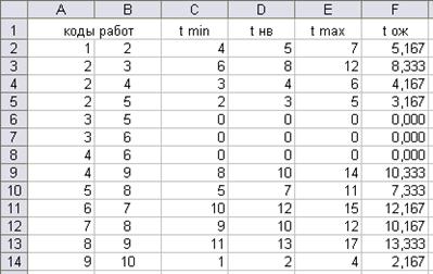 При расчёте с помощью программы «Расчёт и оптимизация сетевого графика» из ППП PRIMA, оценки времени выполнения работ tmin и tmax следует располагать в двух смежных столбцах, а для трёх оценок - значения tmin, tнв и tmax располагаются в трёх смежных столбцах, адреса которых вводятся в программу в окне Время выполнения работ.