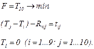 Сформулируем сетевую модель как оптимизационную задачу линейного программирования. Поздний срок свершения завершающего события сетевого графика соответствует длительности самого продолжительного из полных путей - критического. Однако целью сетевого планирования является окончание комплекса работ в возможно короткие сроки. Отсюда целевая функция задачи линейного программирования заключается в нахождении минимального значения позднего срока завершающего события. В качестве ограничений задачи линейного программирования используем выражение для определения частного резерва времени работ. Тогда разность между поздними сроками свершения последующего события Tj и предшествующего события Ti, минус частный резерв времени работы Rчij будет равна продолжительности выполнения работы tij. Поздний срок свершения исходного события (как и его ранний срок свершения) равен нулю. Тогда математическая модель оптимизационной задачи сетевого планирования и управления будет иметь вид: