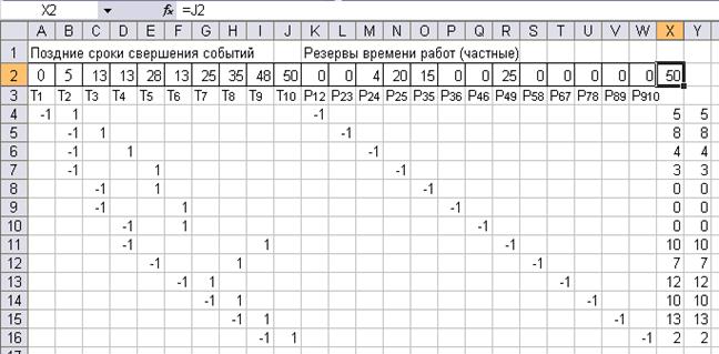 Введём исходные данные для расчёта в электронную таблицу Excel (рис. 56). Строку с адресами A2: W2 используем как область изменяемых ячеек для размещения искомых переменных (поздних сроков свершения событий и частных резервов времени работ). В соответствующие ячейки поля с адреса А4 по W16 вводим коэффициенты при переменных задачи с соответствующими знаками. Ячейка Х2 содержит целевую функцию (=J2), соответствующую позднему сроку свершения завершающего события. В ячейки Х4: Х16 введены выражения для левых частей ограничений. Так, ячейка Х4 содержит функцию (=СУММПРОИЗВ($A$2:$W$2; A4:W4), которая скопирована в ячейки Х5: Х16.