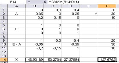 На рис. 66 показаны результаты решения задачи межотраслевого баланса. Вектор валового выпуска Х= (46,93 53,27 27,38). В целевой ячейке величина суммы валовых выпусков отраслей - 127,579 ден.ед.
