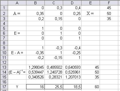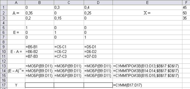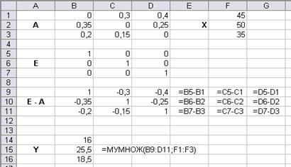 При определении венктора Y используется функция Excel =МУМНОЖ из категории Математические, позволяющая получить результат перемножения матрицы Е-А и вектора Х.