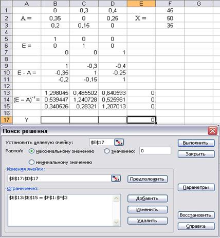 Нажав на кнопку Параметры в диалоговом окне надстройки Поиск решения, укажем с помощью “галочек”: Линейная модель и Неотрицательные значения. Результаты отыскания вектора конечной продукции Y представлены на рис. 70.