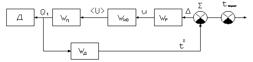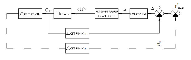 Функциональный анализ системы начинается с составления ее принципиальной схемы. Принципиальная схема термического агрегата представлена на рисунке 52. В представленной схеме каждое звено соответствует реальному звену системы управления. Исполнительный орган преобразовывает электрические управляющие сигналы в параметры управляющего воздействия (силу тока для электрической печи, расход топлива для печей на топливе (газ и т.д.). Печь в некоторых случаях может быть заменена индуктором.