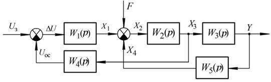На практике, при исследовании САУ, ее структурная схема может оказаться такой, что недостаточным и довольно сложным оказывается применение основных правил структурных преобразований для ее упрощения. Это проявляется при анализе многоконтурных систем, содержащих перекрестные связи. Структурная схема подобной системы приведена на рисунке 58.