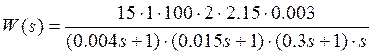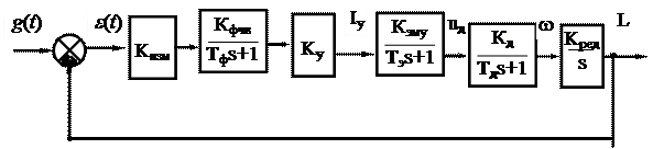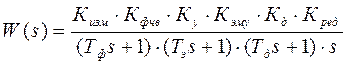 Кизм - передаточный коэффициент измерительного устройства; Кфчв, Тф – передаточный коэффициент и постоянная времени фазочувствительного выпрямителя; Ку - коэффициент усиления электронного усилителя; Кэму Тэ - коэффициент передачи и постоянная времени электромашинного усилителя; Кд, Тд - коэффициент передачи и постоянная времени электрического двигателя; Кред - коэффициент передачи редуктора.