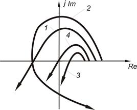 Система является неустойчивой при любом отклонении от критерия Михайлова. На рисунке 68 годограф 1 соответствует устойчивой системе, описываемой уравнением 3-го порядка, годограф 2 соответствует устойчивой системе, описываемой уравнением 4-го порядка, годограф 3 соответствует неустойчивой системе, годограф 4 соответствует системе, находящейся на границе устойчивости, при этом годограф Михайлова проходит через 0.