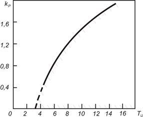 Уравнения системы будут представлены параметрическими уравнениями колебательной границы устойчивости в плоскости с координатами А и В при условии, что действительные части всех других корней будут отрицательными, кроме чисто мнимых корней. Любой точке, находящейся на границе устойчивости, будет соответствовать значение чисто мнимого корня, а значит, будет соответствовать частота колебаний величины выходного параметра. Пример границы области устойчивости ПИ-регулятора в зависимости от величины его параметров (передаточного коэффициента k p и постоянной интегрирования Tи) изображен на рисунке 76.