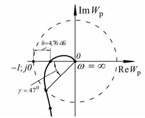 На основании анализа годографа можно заметить, что он не охватывает точку с координатами (−1; j0), пересекая действительную отрицательную ось в точке (0,58; j0). Полученные данные позволяют сделать вывод, что система устойчива и запас устойчивости по модулю составляет h = 4,76 дБ, а запас устойчивости по фазе γ = 470.