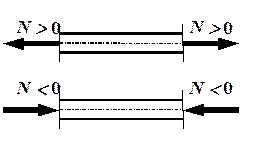 Для определения внутренних усилий в стержнях и стержневых системах используется метод сечений. Согласно этому методу продольная сила – внутреннее усилие, равное сумме проекций всех внешних сил, взятых с одной стороны от сечения, на ось стержня. Примем следующее правило знаков для продольной силы: растягивающая продольная сила положительна, сжимающая – отрицательна (рис. 1.1). Часто внутреннее усилие меняется по длине стержня, в этом случае принято рисовать график изменения усилия вдоль оси стержня, который называется эпюрой. Эпюра позволяет определить, в каком сечении действует максимальное внутреннее усилие (например, найти
