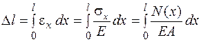 Абсолютная деформация стержня (его удлинение или укорочение) в том случае, если материал стержня работает упруго, т. е. подчиняется закону Гука, определяется так: