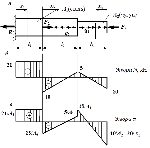 Рис. 1.3. К решению задачи № 1: а – схема нагрузки на стержень; б, в – эпюры продольной силы и напряжений |
