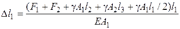 Находим перемещение (опускание) сечения а–а. Это перемещение можно вычислять разными способами. По первому способу для определения перемещения используем формулу (1.4). Здесь F – сосредоточенная сила, вызывающая перемещение участка длиной l; G – собственный вес рассматриваемого участка. Эту формулу можно использовать на участках постоянного сечения между сосредоточенными силами. Отсчет надо вести от неподвижного сечения, т. е. заделки. Например, в рассматриваемой задаче перемещение сечения а–а складывается из удлинения участка длиной l 1, которое мы обозначим D l 1, и удлинения участка длиной la – D la. При определении удлинения D l 1 в формуле (1.4) сила F равна сумме F 1, F 2 и собственного веса всех расположенных ниже участков. Вес рассматриваемого участка стержня длиной l 1:
