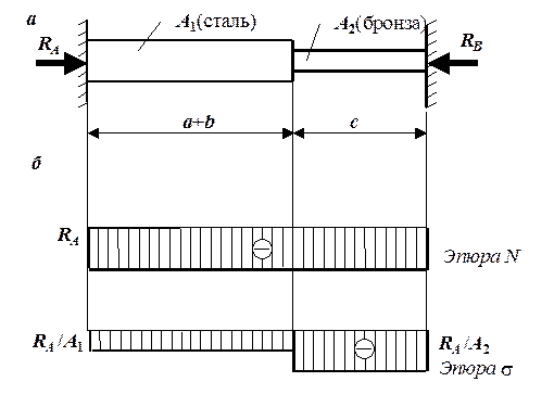 После решения полученной системы уравнений найдем усилия в обеих частях стержня. Полученный положительный знак должен подтвердить предположение о том, что стержень сжат. Строим эпюры продольной силы и напряжений (рис. 1.10, б) от температурного воздействия.
