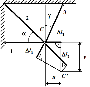 Имеется шарнирно-стержневая система, состоящая из трех деформируемых стержней, загруженная силой